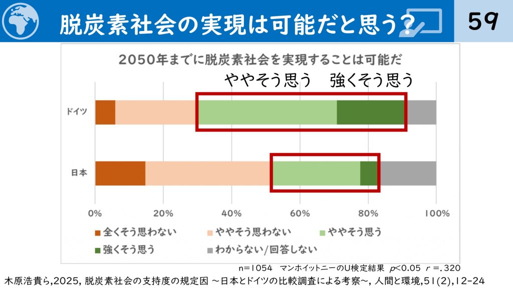 心理パラドックスの1つが「実現可能と思わないと、重要と思わない」日本人は、気候変動が心配だけど、取り組まなきゃとは思わない。「気候変動を止めるのは無理だ」「気候対策は負担だ」と思っているから。
